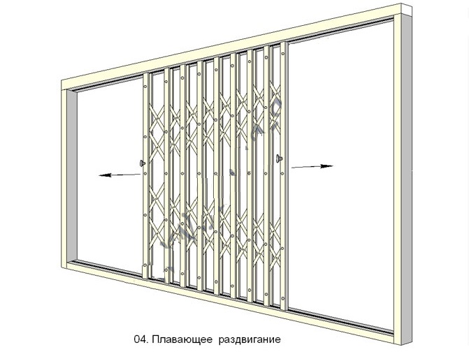 - Конструкцию сдвигаемой гармошки на шарнирах (петлях) для поворота ее на 90 градусов в случае стесненных условий и необходимости сохранения ширины проходного габарита;